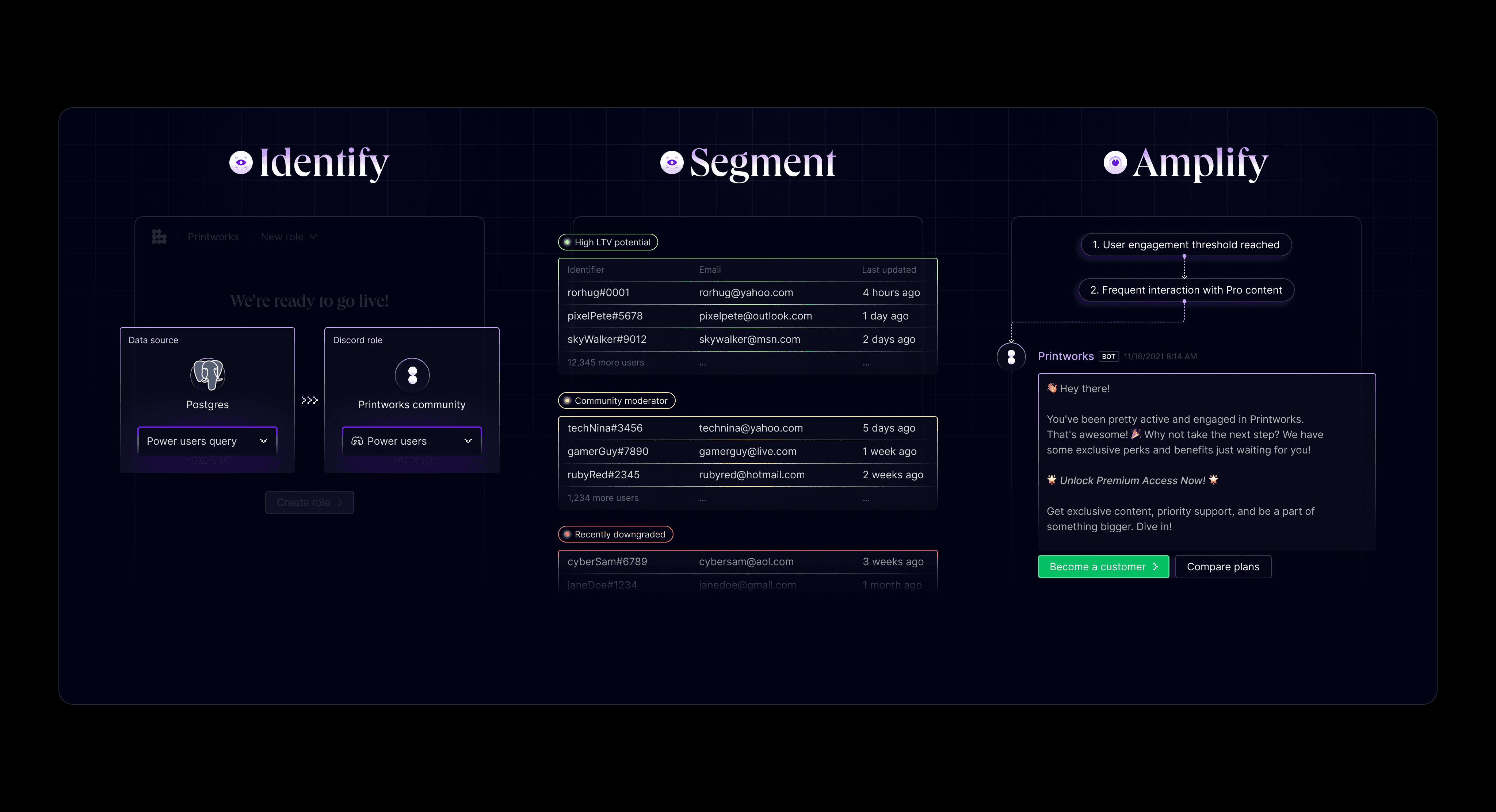 At its core, Bind connects customer information with Discord, allowing teams to segment users into tailored groups — such as customers, power users, or leads — and automate role distribution accordingly. The platform also supports custom calls-to-action and community activation features that drive members toward desired behaviors and help measure the impact of community efforts.